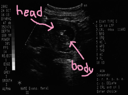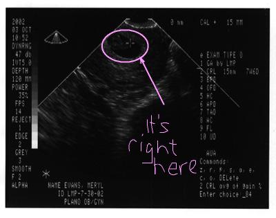 Today's appointment was the doppler appointment (hearing the heartbeat with a special stethoscope). There were a couple of brief instances where the doctor could hear the heartbeat, but then mama's heartbeat would drown it out. So back to sonogram and all is good. This blog is officially open to anyone who wants to read a pregnant woman drone on for another 29 weeks. (Due date May 16, 2003.) Click on the photo for more detail.